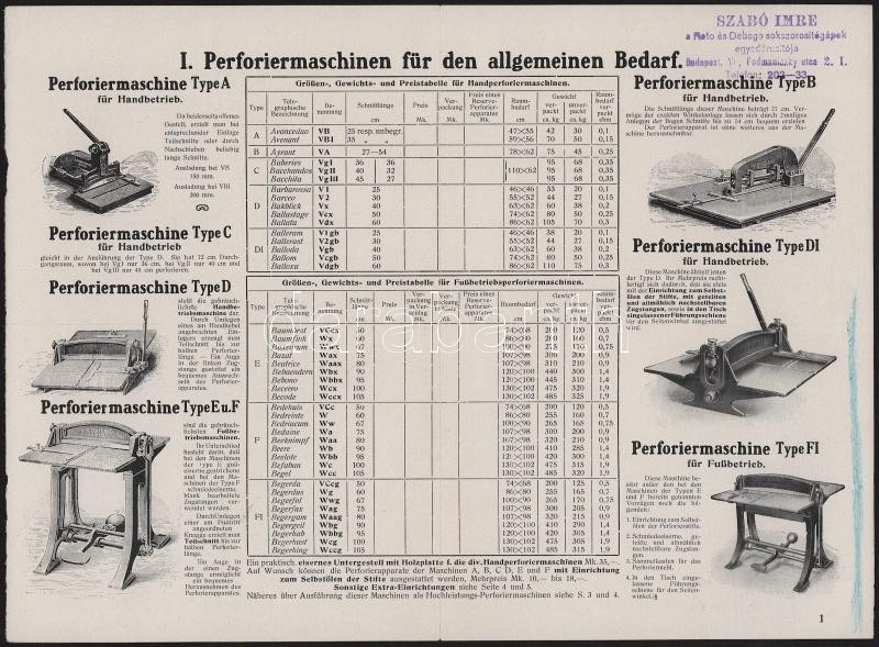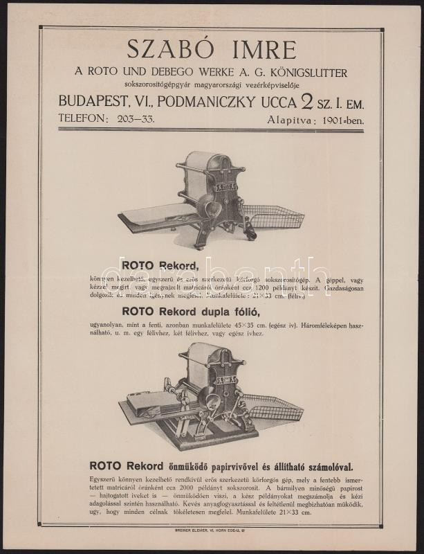 cca 1930 Bp. VI., Podmaniczky u. 2., Szabó Imre a Roto és Debego sokszorosítógépgyár képviselőjének 5 db nyomdaipari prospektusa