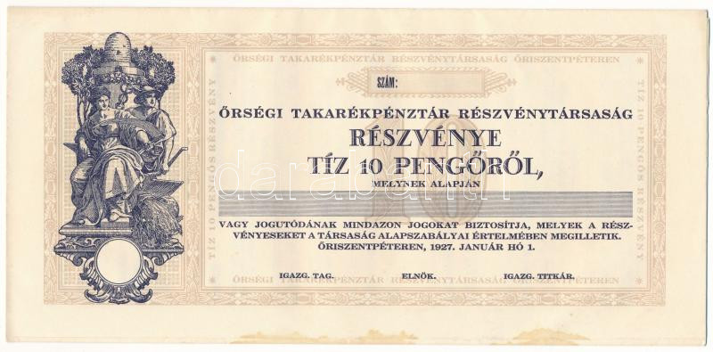 1927. Őriszentpéter "Őrségi Takarékpénztár Részvénytársaság" részvénye 10P-ről T:AU