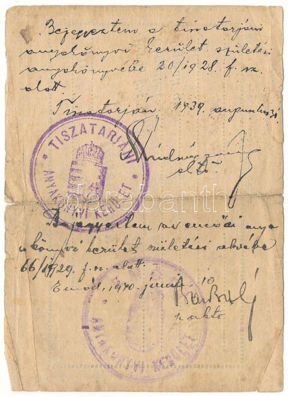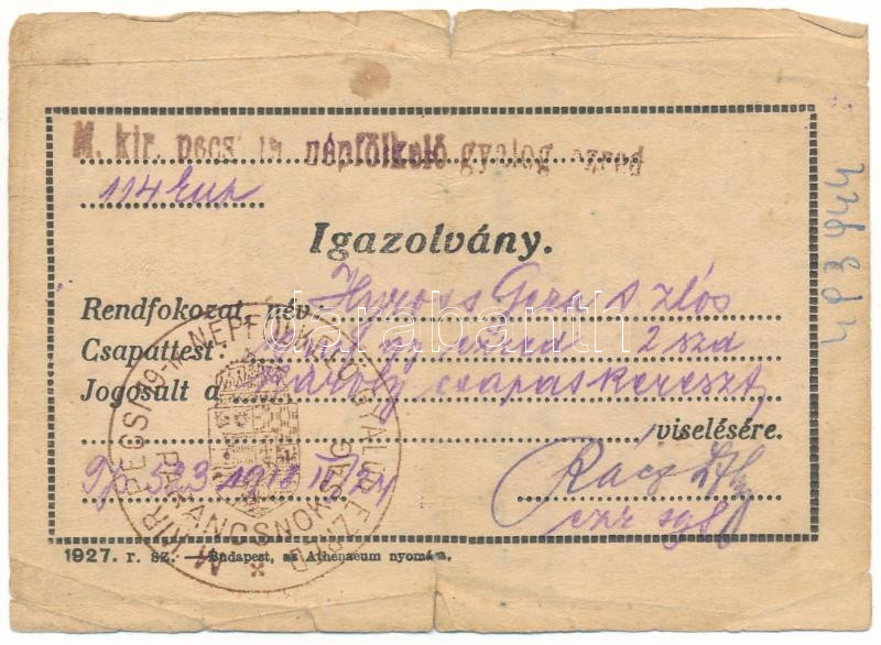 Hungary 1918. Bearer's ID for the "Charles Troop Cross" with stamp from the "Hungarian Royal Infantry Regiment of Pécs" and with "Tiszatarjáni anyakönyvi kerület" stamp on the back T:VG