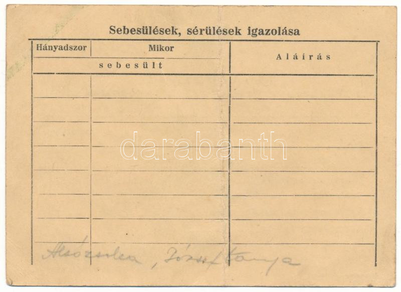 1944. Névre szóló, kitöltött viselői igazolvány a Tűzkereszt II. fokozatához, a "M. Kir. 7. Honv. Fogatolt Vonat Pótosztály Parancsnokság" pecsétjével T:F