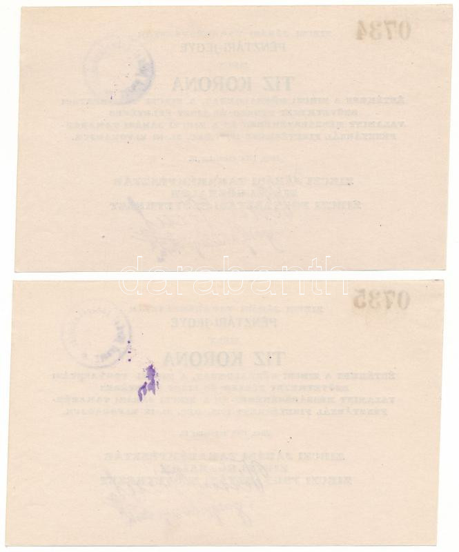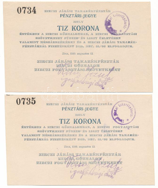 Hungary / Zirc 1919. 10 Korona "Receipt of the District Savings Bank of Zirc" (2x) consecutive serials "0734-0735" C:AU