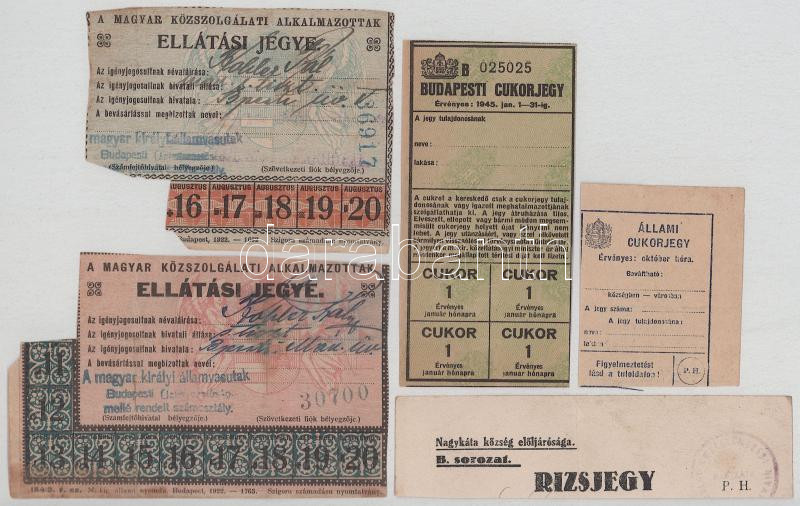 1922. "A Magyar Közszolgálati Alkalmazottak" ellátási jegye (2xklf) + 1945. Budapesti cukorjegy + DN Állami cukorjegy + Rizsjegy T:F