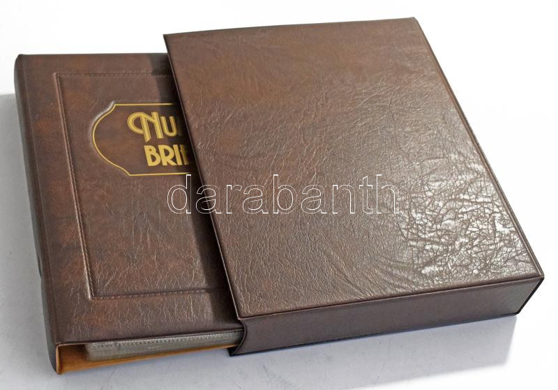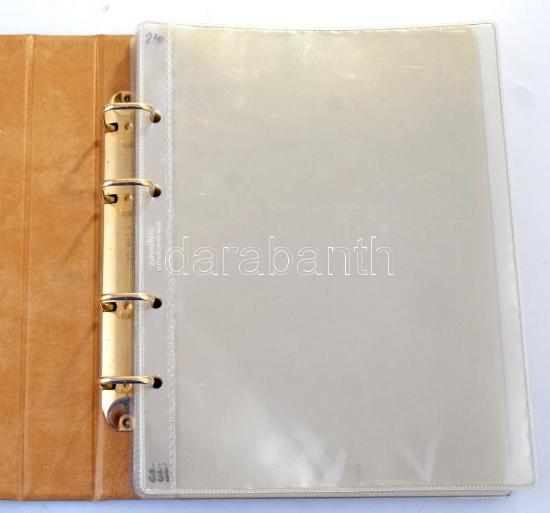Négygyűrűs, barna műbőr "Numis Briefe" album, 21db osztás nélküli és 19db kettes osztású berakólappal, tokkal. Használt, jó állapotban