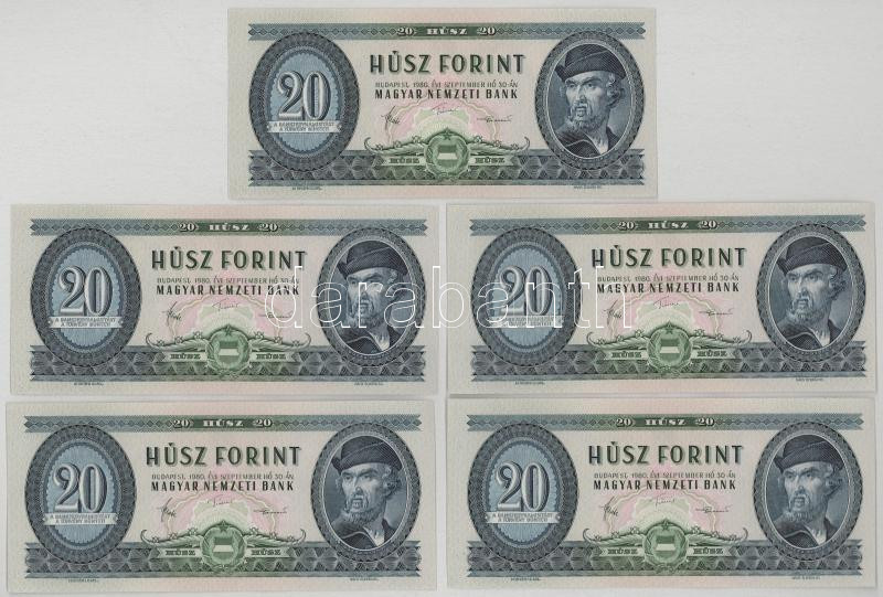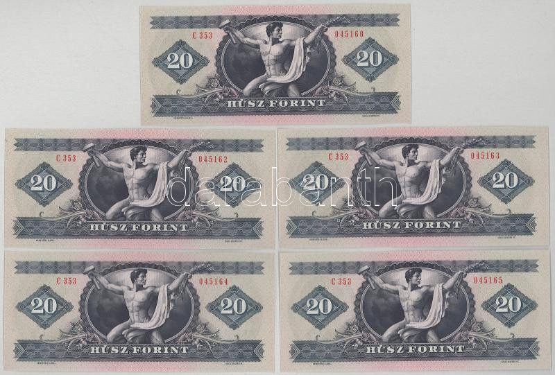 1975. 20Ft (5db) 4x sorszámkövetők + egy közeli sorszám "C 353 045160 + C 353 045162 - C 353 045165" T:AU hullámos papír