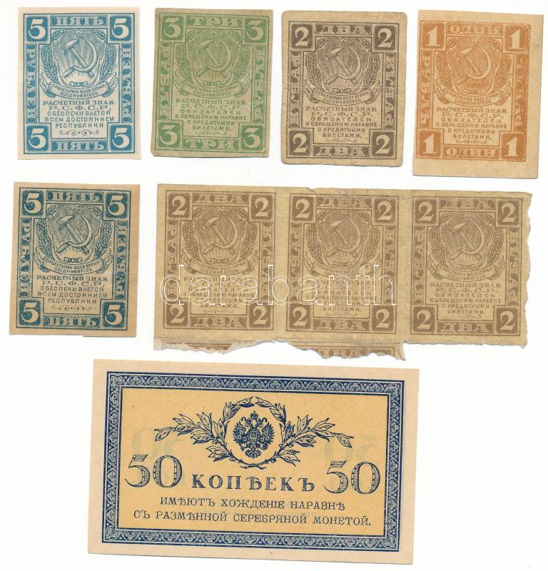 Szovjetunió / Orosz Szocialista Szövetségi Szovjet Köztársaság 1919-1922. 1R + 2R (4db, ebből 3 vágatlan ívben) + 3R + 5R (2x) + 50K T:XF-VG