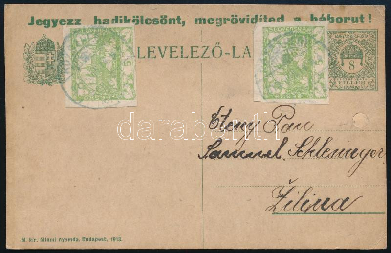 1919 8f díjjegyes levelezőlap csehszlovák díjkiegészítéssel "RÓZSAHEGY"