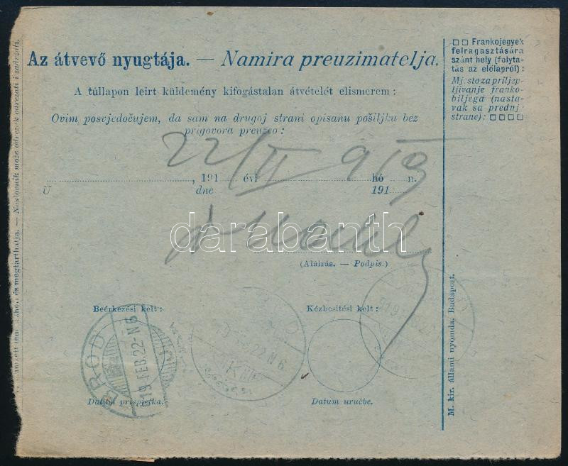 1919 Utánvétes szállítólevél dekoratív 4 bélyeges horvát bérmentesítéssel "ZAGREB"