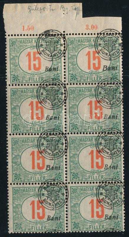 Nagyvárad 1919 Pirosszámú portó 15f ívszéli 8-as tömb eltolódott felülnyomással, Bodor vizsgálójellel
