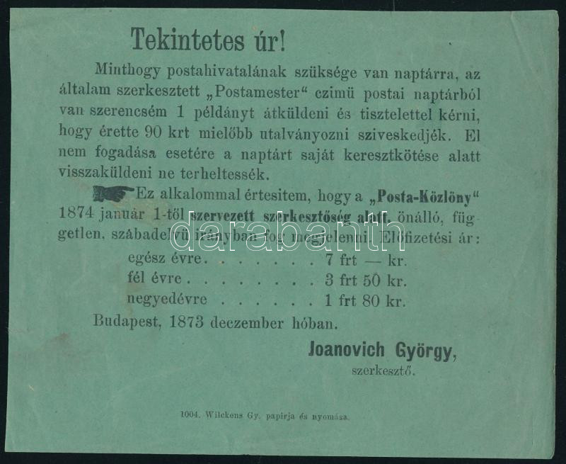 1873 Nyomtatvány a Posta-Közlöny c. újsgáról