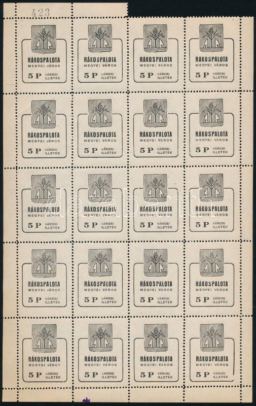 1945 Rákospalota városi illeték 5P fehér sorszámozott teljes ív, benne lemezhibák (15.000)
