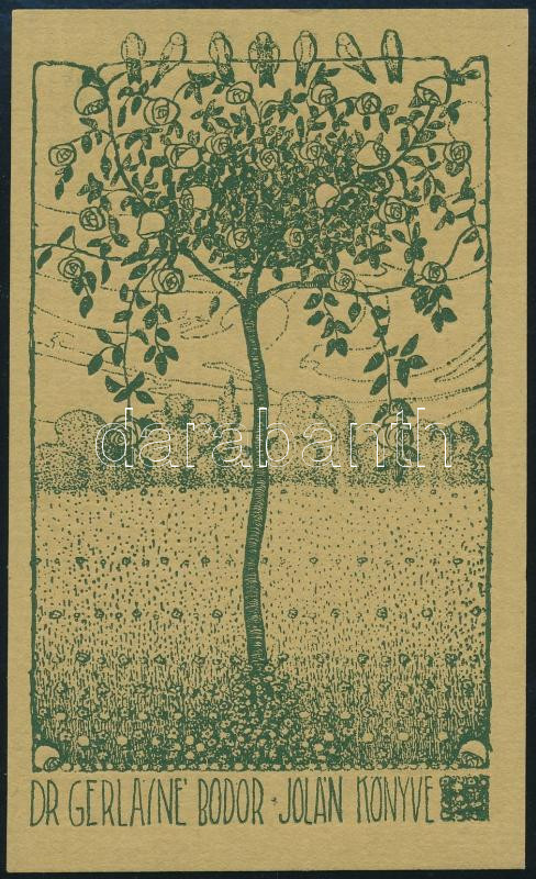Gyömrői Sándor József (1887-1936): Dr. Gerlainé Bodor Jolán könyve (Szecessziós ex libris). Vonalas klisé, papír, jelzés nélkül. 12x7 cm.