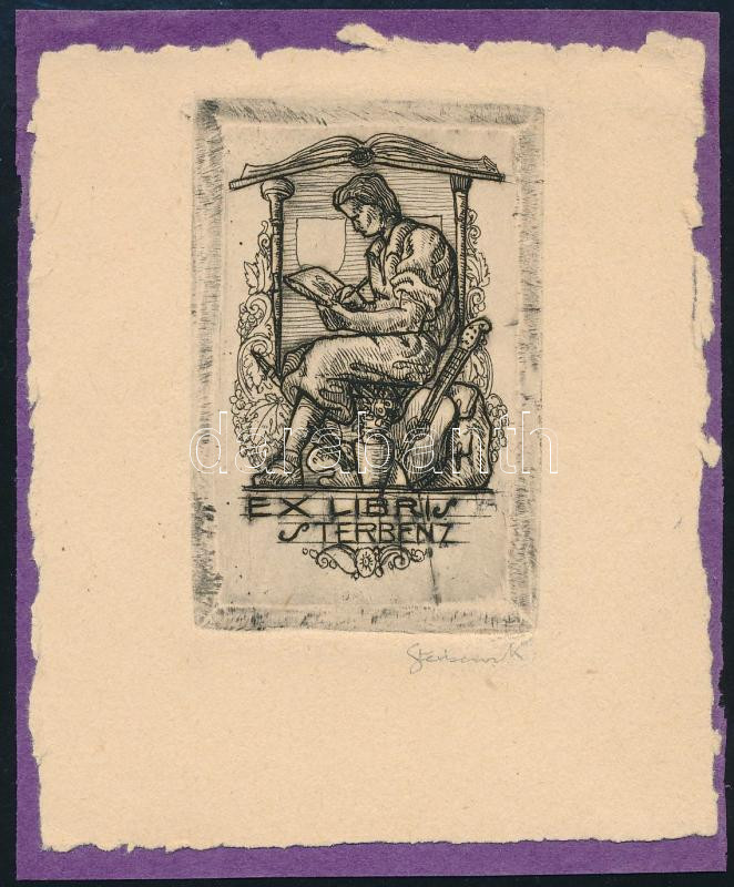 Sterbenz Károly (1909-1993): Ex libris Sterbenz. Rézkarc, papír, jelzett, lap teteje papírra kasírozva, 7x5 cm.
