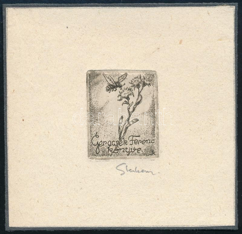 Sterbenz Károly (1909-1993): Geracsek Ferenc könyve (ex libris). Rézkarc, papír, jelzett, lap teteje papírra kasírozva, 3,5x2,5 cm.