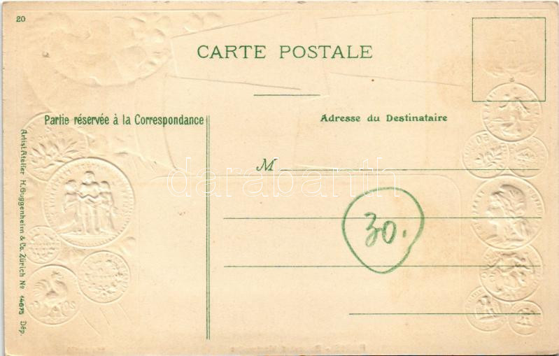 Paris, Boulevard Montmartre. Art Nouveau, Emb. litho with French coins and banknotes (pinhole)
