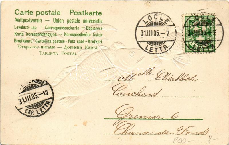 1905 1er Avril. Tu soignes ta fraicheur trop tard, crois-moi, rengaine ton riflard / 1st of April greeting card with fishes. Emb. (EK)