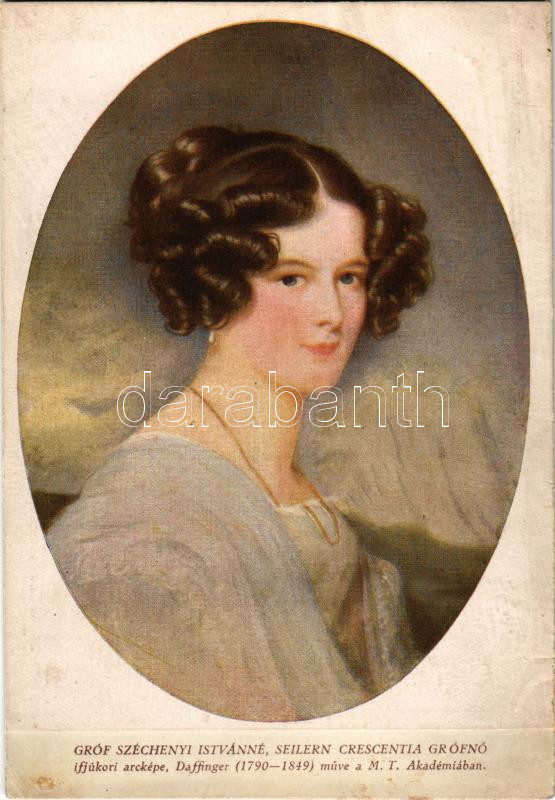 Gróf Széchenyi Istvánné, Seilern Crescentia grófnő ifjúkori arcképe, egyedi készítésű (ragasztott) lap / Mrs. Istvan Szechenyi, wife of the Hungarian politician, hand made (glued) postcard s: Daffinger (ragasztónyomok / glue marks)