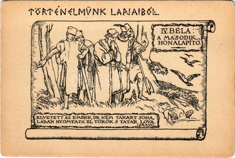 Történelmünk lapjaiból. IV. Béla: a második honalapító. Tatárdúlás után: Geiger H. kőrajza - Betűország képeslap / Hungarian irredenta art postcard