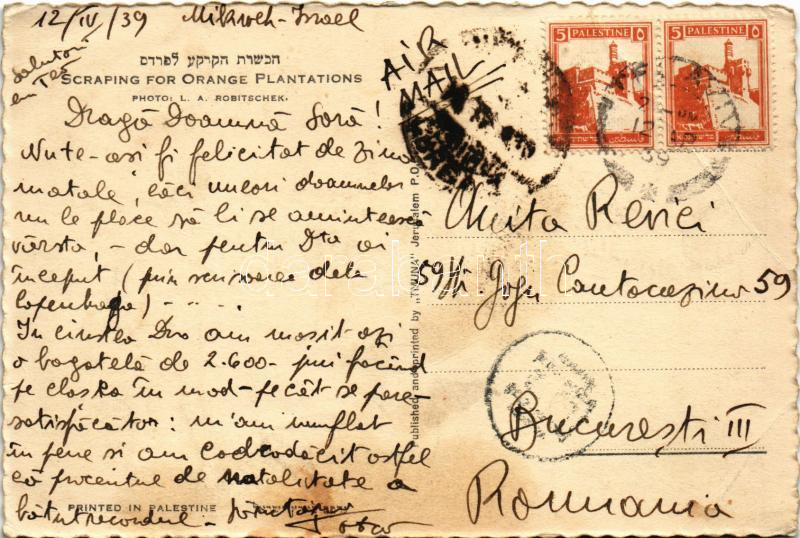 1939 Scraping for orange plantations. Photo L. A. Robitschek. Published and printed by "Tmuna" Jerusalem, printed in Palestine (fa)