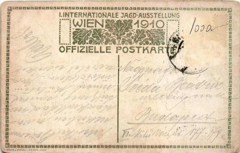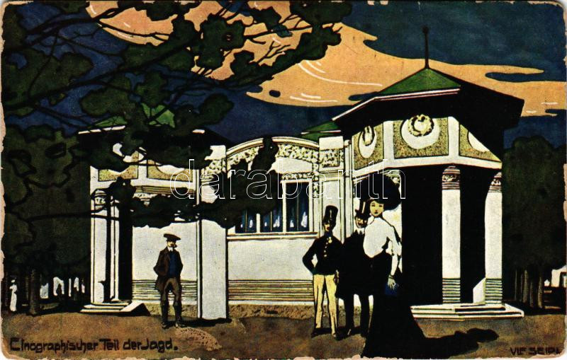 1910 I. Internationale Jagdausstellung Wien. Offizielle Postkarte. Cinograpischer Teil der Jagd / Első bécsi nemzetközi vadászati kiállítás reklámlapja / 1st International Hunting Expo in Vienna. Art Nouveau advertisement postcard s: Ulf Seidl (kopott sarkak / worn corners)