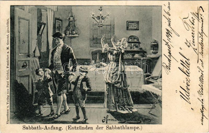 1899 Sabbath-Anfang (Entzünden der Sabbathlampe) Verlag Paul Grödel / Shabbat, lighting of the Shabbat lamps, candles. Judaica s: Hermann Junker (r)