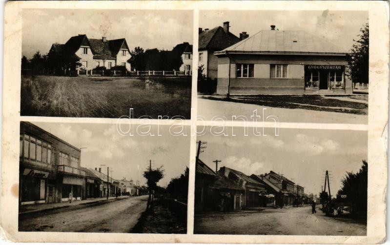 1944 Aknaszlatina, Akna Slatina, Slatinské Doly, Szolotvino, Solotvyno (Máramaros); Fő utca, gyógyszertár, üzletek. Bozsuk Gyula kiadása / main street, pharmacy, shops (EB)