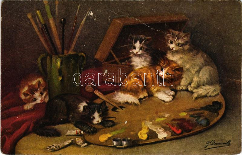 Macskák festőecsetekkel és palettával. No. 120. / cats with paintbrushes and palette s: Decauville (felületi sérülés / surface damage)