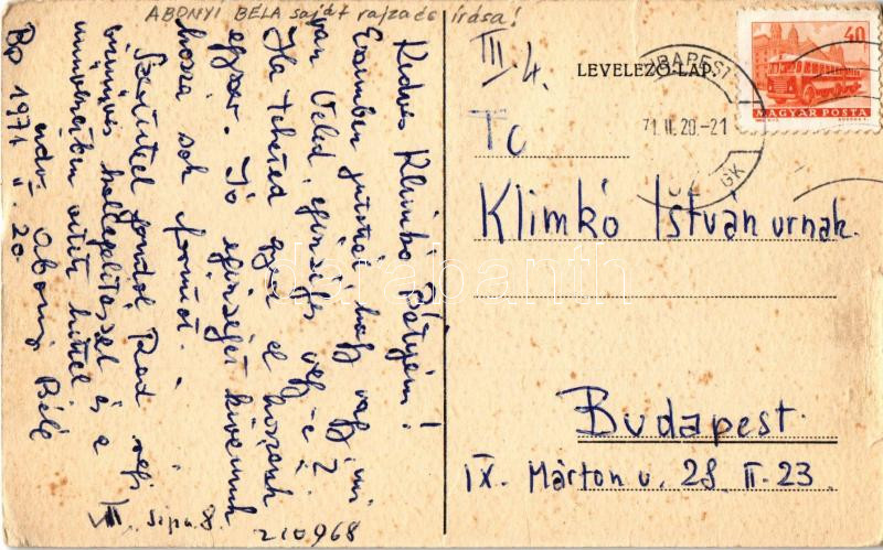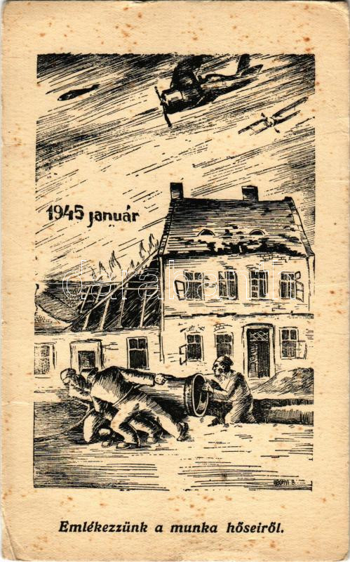 1971 Emlékezzünk a munka hőseiről, 1945 január, katonai repülő. Abonyi Béla nyomtatott rajza és saját kezű levele / WWII Hungarian military, printed drawing, with the letter of the artist s: Abonyi B. (szakadások / tears)