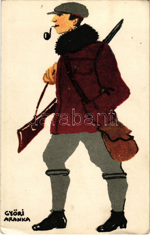 Pipázó vadász művészlap. Diana sósborszesz reklám a hátoldalon / Pipe smoking hunter. Hungarian art postcard, sport, creme advertising on the backside s: Győri Aranka (fl)