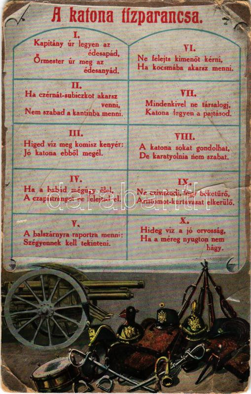 1913 A katona tízparancsa / WWI Austro-Hungarian K.u.K. military humour art postcard, ten commandments of the soldier (b)