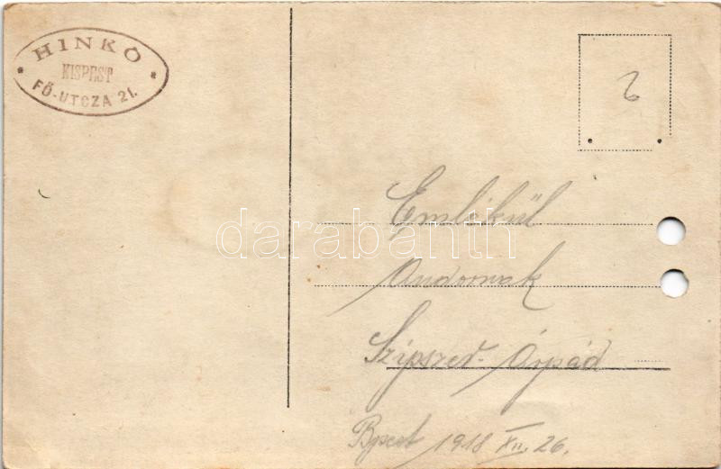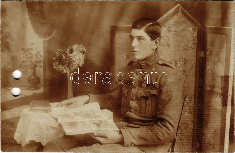 1918 Magyar katona műteremben. Hinkó felvétele (Kispest) / WWI Austro-Hungarian K.u.k. military, Hungarian soldier. photo (lyukasztott / punched)