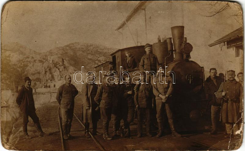 Első világháború, osztrák-magyar katonák gőzmozdonnyal, vasút / WWI Austro-Hungarian K.u.k. military, soldiers with locomotive, train. photo (kopott sarkak / worn corners)
