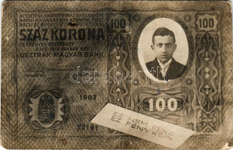 Száz korona bankjegy mintájára készült fotó képeslap férfi portréval "Ez nem pénz, ez fénykép" / photo postcard modeled after the 100 Kronen banknote with a man's portrait "This is not money, this is a photo" (EM)