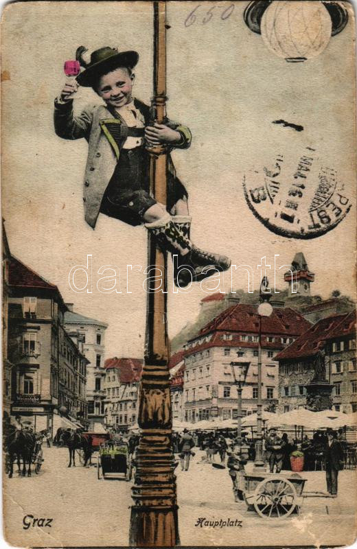 Graz (Steiermark), Hauptplatz / main square, market, café. Montage with boy sliding down a lamp post (EB)