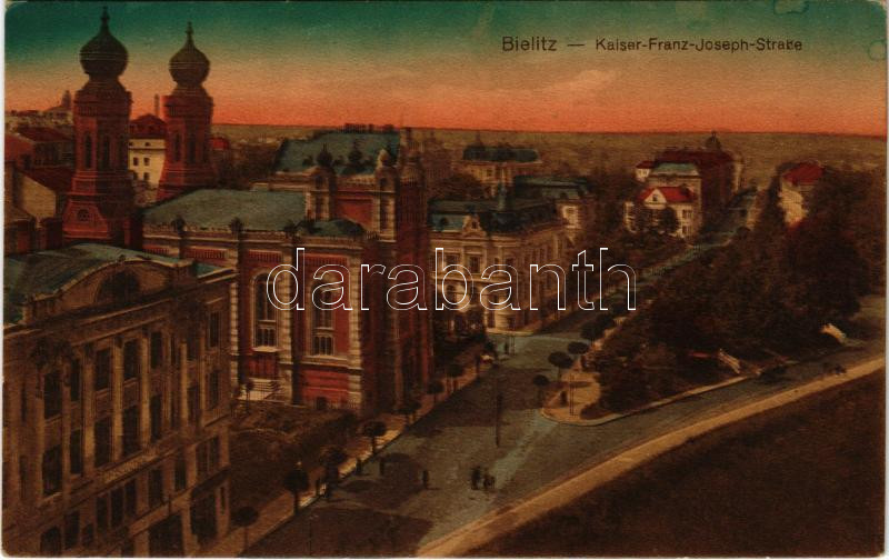 1914 Bielsko-Biala, Bielitz; Kaiser-Franz-Joseph-Strasse / Ferenc József utca, zsinagóga / street, synagogue (fl)