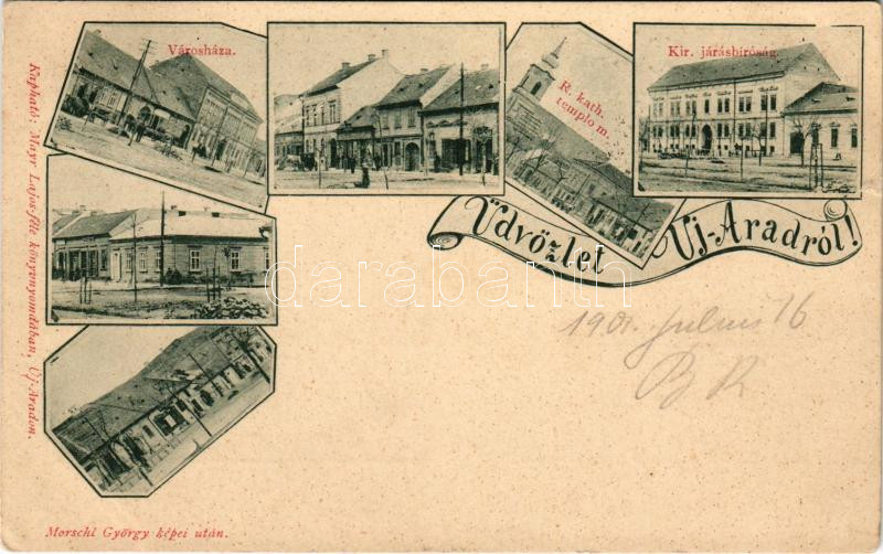 1901 Arad, Újarad, Új-Arad, Aradul Nou; Városháza, Római katolikus templom, Kir. Járásbíróság, üzletek. Mayr Lajos kiadása, Morschl György képei után / town hall, Catholic church, district court, shops. Art Nouveau (kis szakadás / small tear)