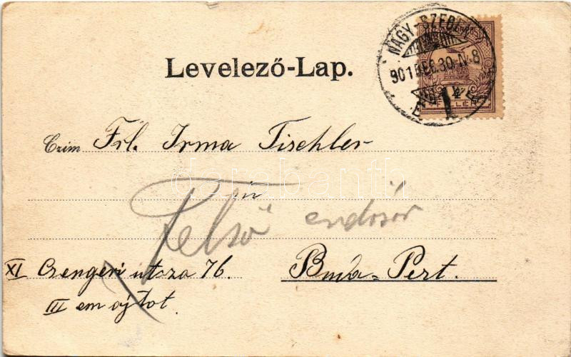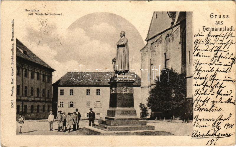 1901 Nagyszeben, Hermannstadt, Sibiu; Tér és Teutsch püspök szobra. Karl Graef / Huetplatz mit Teutsch Denkmal / square, statue (ázott sarkak / wet corners)