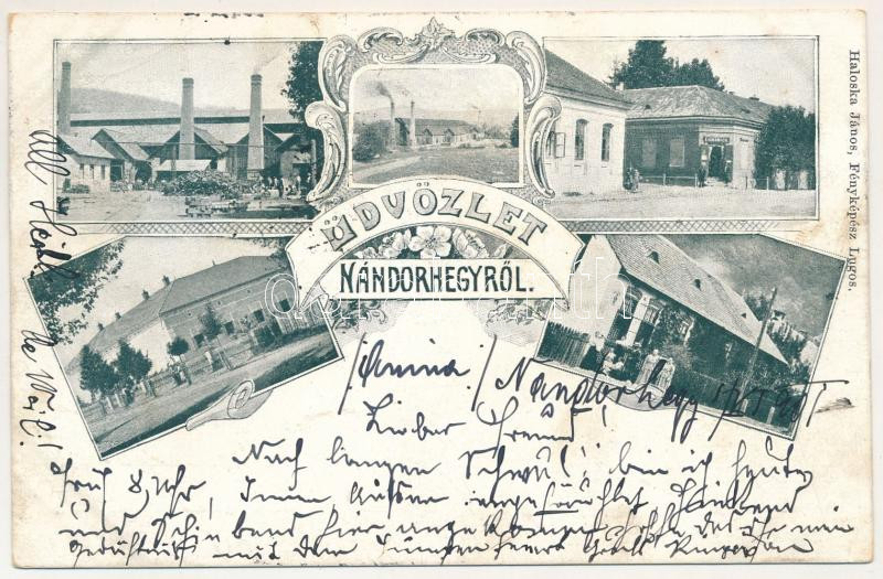 1901 Nándorhegy, Otelu Rosu, Ferdinand, Ferdinandsberg; Acélgyár, Martin kemence, üzlet. Haloska János fényképész kiadása, szecessziós-virágos keret / steel factory, shop. Art Nouveau, floral frame (fl)