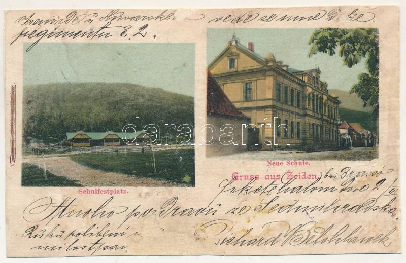 1902 Feketehalom, Zeiden, Codlea; Schulfestplatz, Neue Schule / új iskola és az iskolai fesztiváltér. G. Foith kiadása / new school, school's festival ground (r)