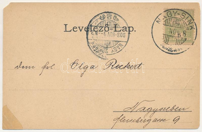 1903 Morgonda, Mergeln, Merghindeal; Evangélikus templom és iskola, Fő utca, jegyzőlak, községi iroda / Lutheran church and school, main street, notary. Art Nouveau, floral (EM)