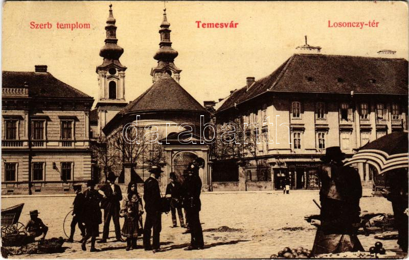 1906 Temesvár, Timisoara; Losonczy tér, Szerb ortodox templom, Kerscher üzlete. 26. (W.L. ?) / square, Serbian Orthodox church, shops (EB)