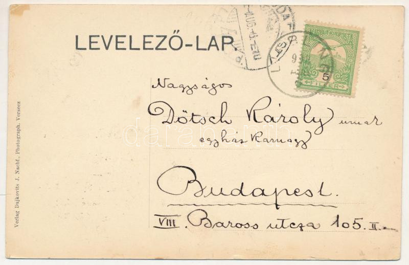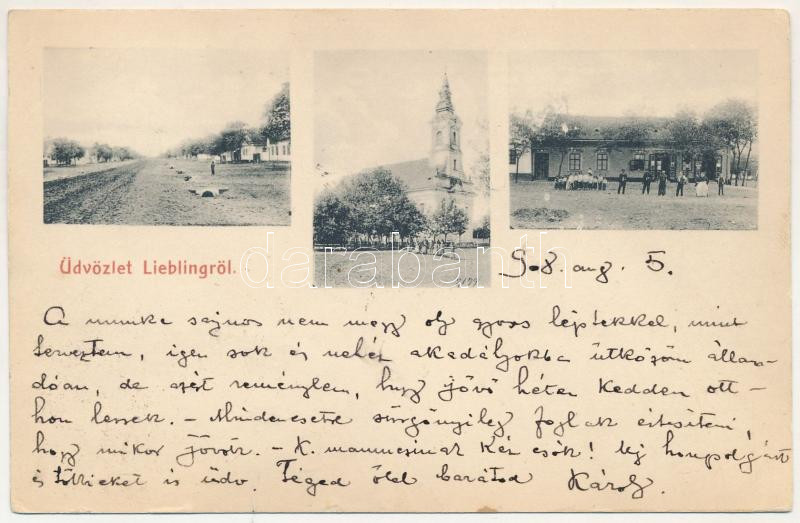 1908 Liebling (Temes), utca, templom. Dajkovits J. fényképész utóda kiadása / street view, church (vágott / cut)
