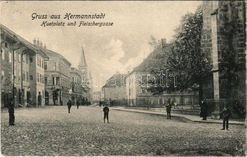1908 Nagyszeben, Hermannstadt, Sibiu; Huetplatz und Fleischergasse / Huet tér, Mészáros utca, üzletek. Karl Graef kiadása / square, street, shops (EK)