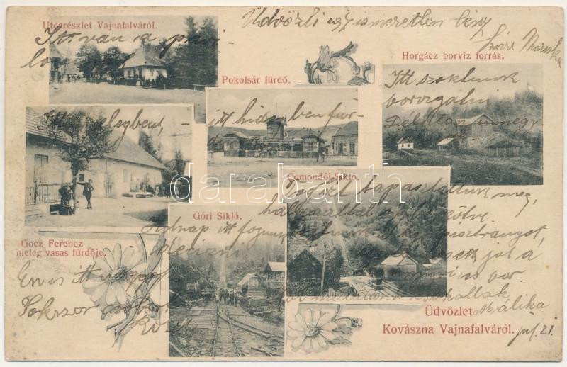 1911 Vajnafalva, Voinesti (Kovászna, Covasna); Góri Sikló, Gocz Ferenec fürdője, Pokolsár, Komandói sikló, Horgác borvízforrás. Papp Ferenc kiadása / spas, funiculars. Art Nouveau, floral + "VAJNAFALVA POSTAI ÜGYN." (EB)