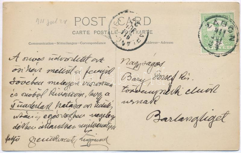 The oldest building in Transylvania's Zágon is the Mikes-Szentkereszty manor house, built in 1623, with Baroque features, which is traditionally considered to be the birthplace of Mikes Kelemen. The castle acquired its current form in 1903, following the renovations of Baron Zsigmond Szentkereszty (the sender of the postcard). Today it is called the Mikes Cultural Center.
