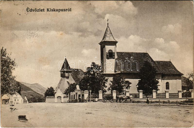 1912 Kiskapus, Kis-Kapus, Kleinkopisch, Copsa Mica; utca, evangélikus és római katolikus templom / street with, Lutheran church, Catholic church (EB)