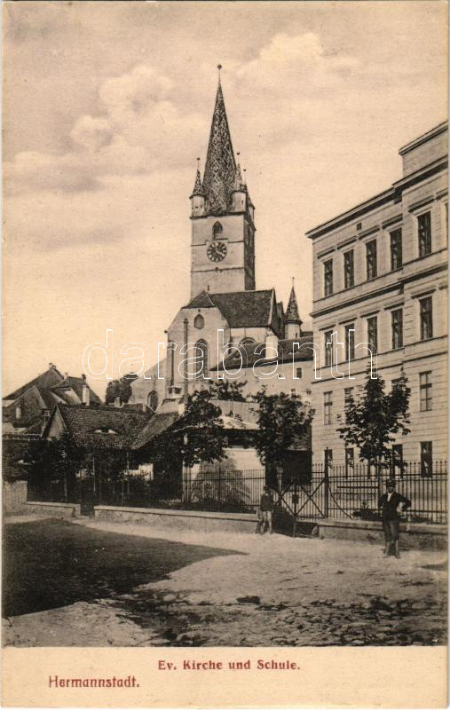 1913 Nagyszeben, Hermannstadt, Sibiu; Ev. Kirche und Schule. Verl. d. Buchh. G. A. Seraphin. Lichtdruck von Jos. Drotleff / Evangélikus templom és iskola