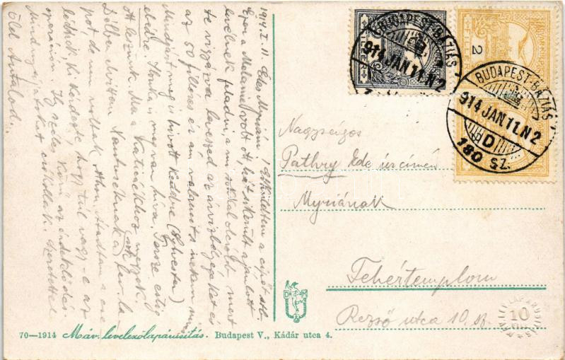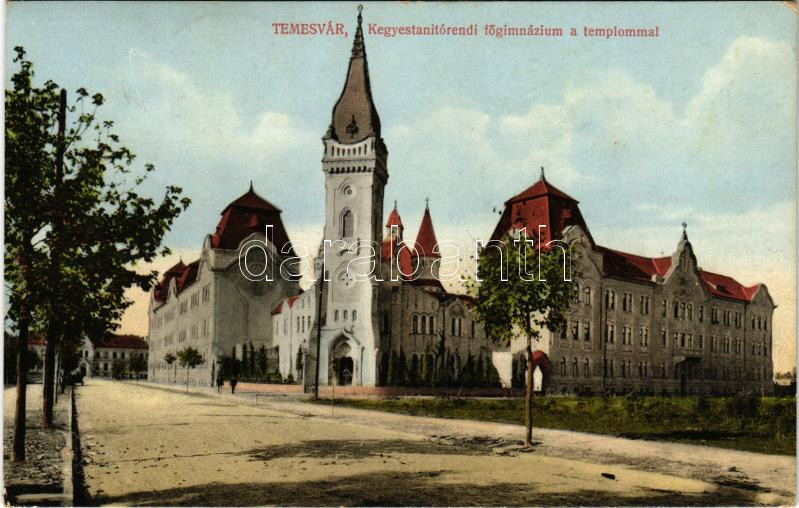 1914 Temesvár, Timisoara; Kegyestanítórendi főgimnázium a templommal. MÁV levelezőlapárusítás 70-1914. / grammar school and church + "BUDAPEST - BÁZIÁS 180. SZ. D" vasúti mozgóposta bélyegző (EK)