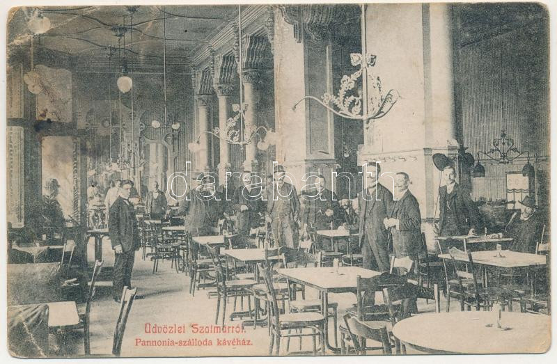 1915 Szatmárnémeti, Szatmár, Satu Mare; Pannonia szálloda kávéháza, belső vendégekkel és pincérekkel. Cseplák Bálint kiadása, Tóth S. Imre fényképész felvétele / hotel, café interior with guests and waiters (fa)