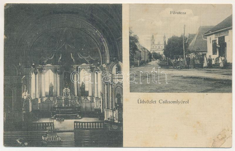 1916 Csíksomlyó, Sumuleu Ciuc; Fő utca, üzlet, kegytemplom belső / main street, shop, pilgrimage church interior (ragasztónyom / glue marks)