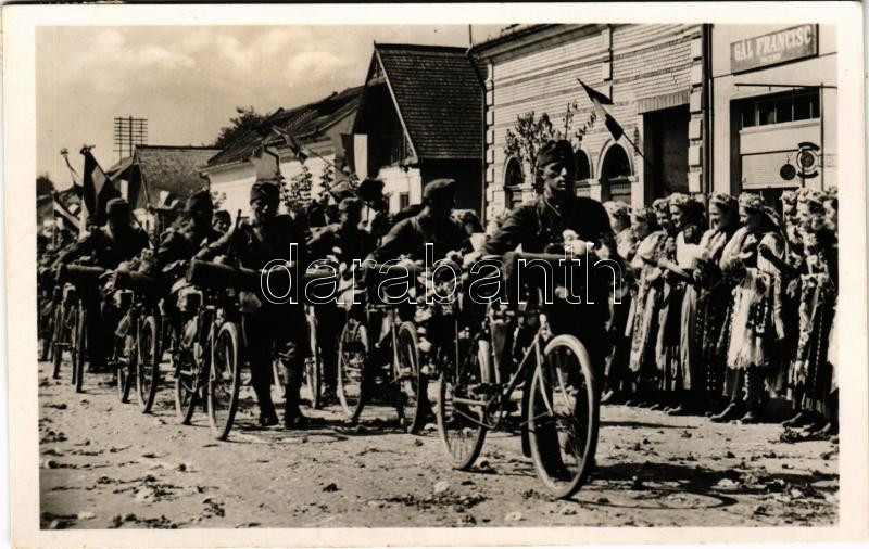 1940 Bánffyhunyad, Huedin; bevonulás, kerékpáros katonák / entry of the Hungarian troops, soldiers with bicycles + "1940 Bánffyhunyad visszatért" So. Stpl.